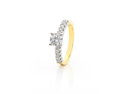 18ct Yellow and White gold Solitaire diamond ring with claw set side diamonds feturing a 0.60ct centre Diamond.