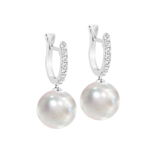 18ct white gold diamond set huggie earrings with 10mm round Australian South Sea pearls.